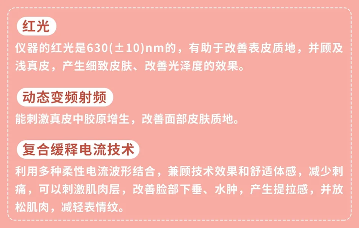 雅M这款美容仪主打的技术是红光+射频+微电流的复合。